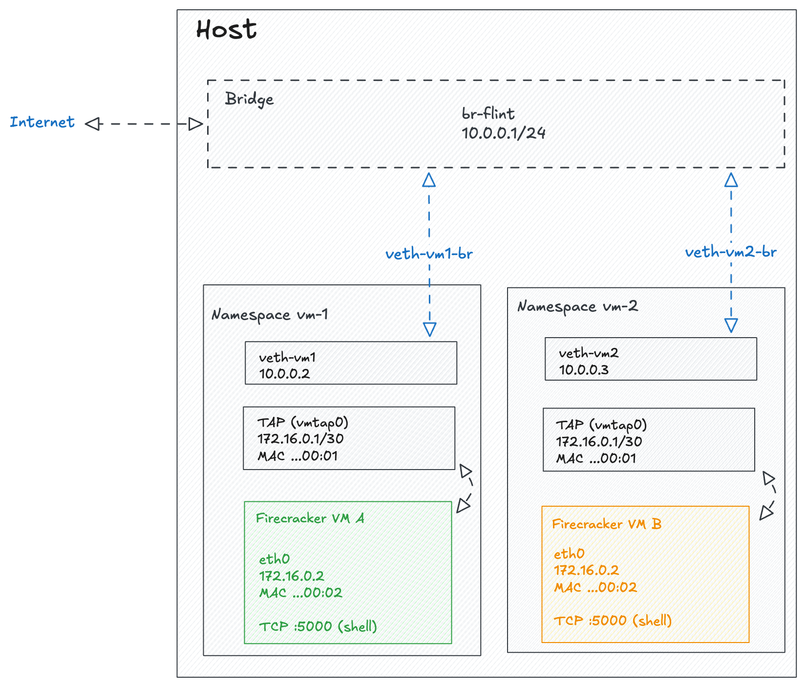 Each VM lives in its own network namespace with a TAP device connecting it to the host side of that namespace.